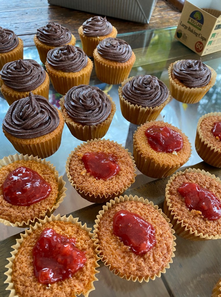 Today was the outdoor birthday party at a park. I needed to sort out strawberry cupcakes and settled on what I will declare as my most successful cake of this three cake weekend. This time I used the King Arthur Classic Birthday Cake for both the cupcakes and the icing. And I made another strawberry compote with a bunch of strawberry jam and some frozen strawberries and a bit of cornstarch. The cake recipe yielded 24 cupcakes PLUS a 6″ round cake (which I froze for some other cake emergency). It was the perfect cake texture and it now going to be my go-to for cupcakes.